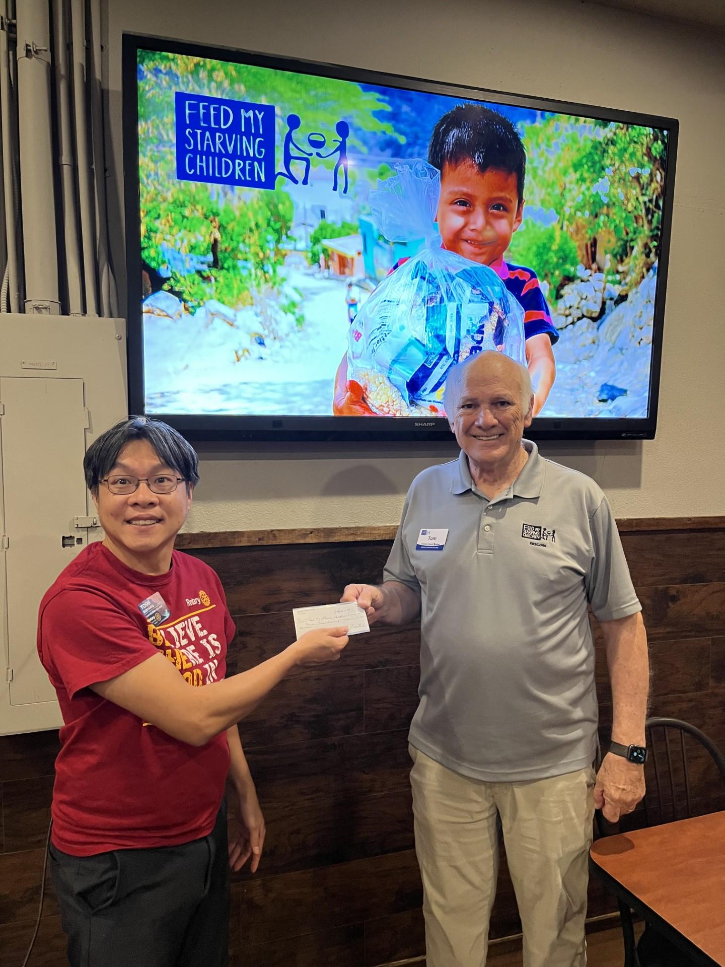 Tom Crowell, from FMSC, visited the club on July 29th. Cris Sar, our AG from Tempe South, also attended the meeting. Coincidentally, he was coordinating a joint Tempe club service project with Camelback Crossroads and Tempe South at FMSC for August 14th. Feed My Starving Children is a non-profit with offices across the country with a goal to work "Until all are fed." They distribute 1 million meals around the world including Africa, Haiti, and the Philippines.Feed My Starving Children